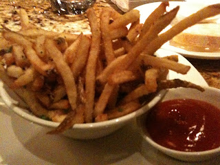 Before the appetizers arrived, we were brought a plate of fresh french bread and olive oil for dipping. One nice touch was the salt and pepper sprinkled on the plate so that you could dip in the oil and then dip in the salt and pepper. Never seen it done that way before. Also never had my frites served in an old-fashioned metal measuring cup, but it was cute.